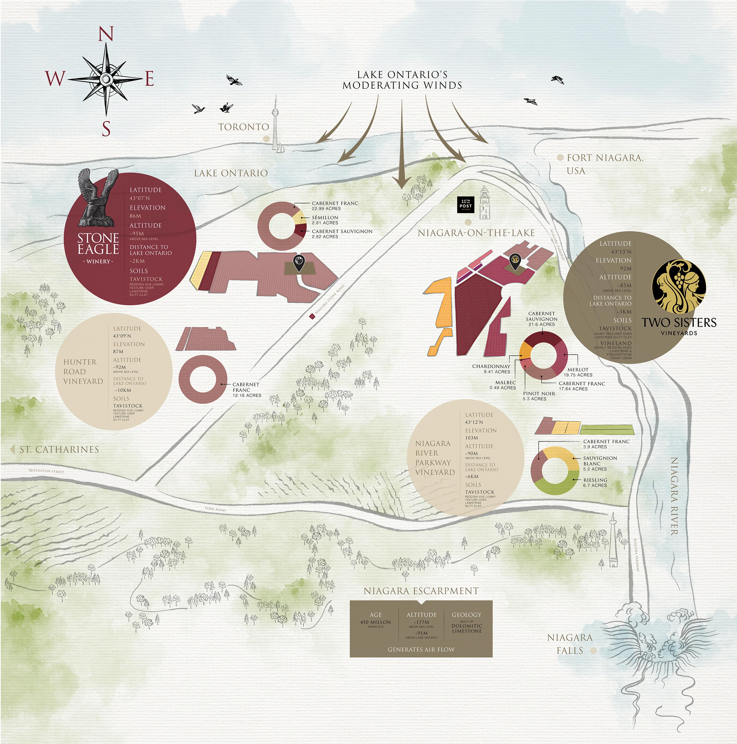 Stone Eagle’s Estate vineyard is set on 30 acres of former peach and apple orchards. The Tavistock soils are about 95 meters above sea level, the proximity to Lake Ontario provides a uniquely warm microclimate and extended growing season. Each vine is meticulously tended throughout the year, embodying the science of viticulture and the art of letting the vineyard speak. The crop is limited by actively thinning clusters and leaf removal maximizes exposure of the grapes to all-important sunshine. This harmony between land and craft allows Stone Eagle to nurture the best possible fruit from every vine in every vintage.