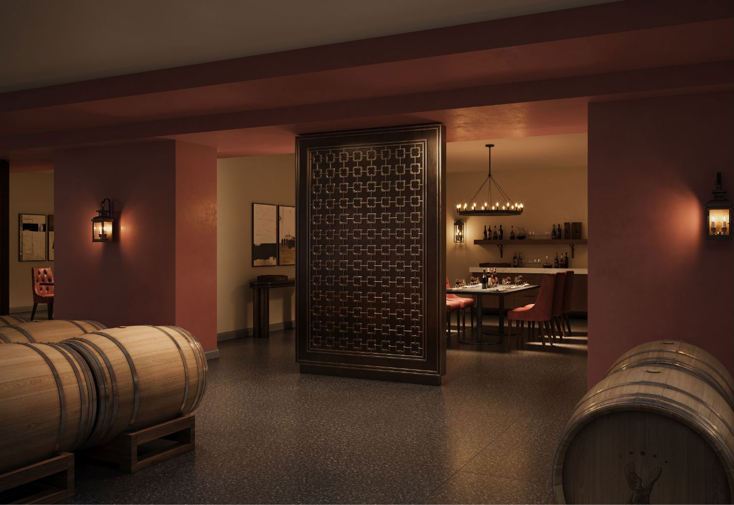 Tucked beneath the working cellar, these rooms immerse guests in the atmosphere of the winery itself. Boardroom-style tables and upholstered chairs create an intimate setting for tastings or seminars. What defines the experience is the setting: rows of oak barrels quietly age, filling the space with the subtle scent of the cellar. It’s a rare opportunity to immerse yourself in architecture designed to balance function, focus, and authenticity.